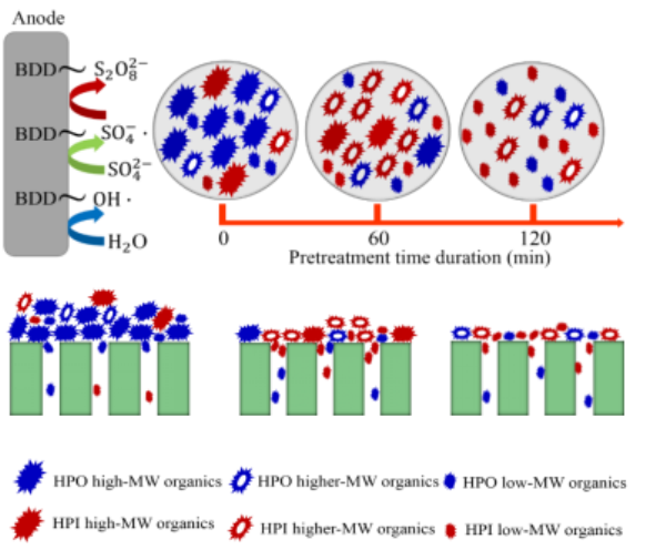 围绕膜法水处理过程中由膜污染引起的低通量难题,分别从优化膜分离工艺和膜材料本身的抗污染能力进行探索研究。一方面提出一种分体式电化学氧化-超滤组合工艺用以模拟实际受污染水体的组合工艺处理机制,揭示了预氧化工艺缓解控制膜污染的机理,对于膜分离组合工艺的推广应用提供理论支撑(Environmental Science and Pollution Research 2019, 26(17):17740-17750;Separation and Purification Technology, 2020, 259:118110;Membranes 12, no. 1 (2022): 78.);